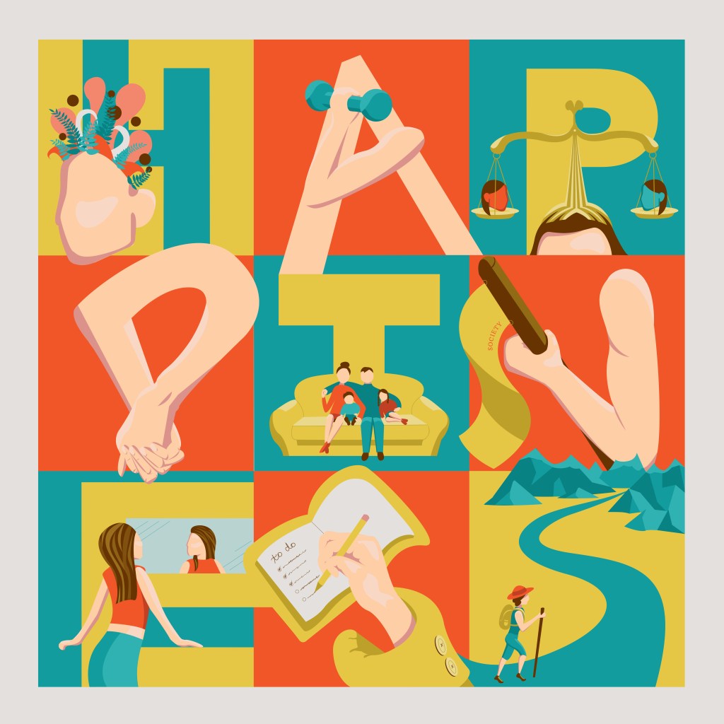 26″ x 26″, Adobe Illustrator, School Project, Based on The World Book of Happiness (author unknown), Fall 2020